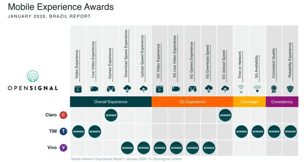 No quesito experiência de vídeo, o relatório da Opensignal revela um cenário de alto nível técnico e forte equilíbrio entre as principais operadoras. De forma geral, TIM e Vivo aparecem como as empresas mais bem posicionadas no levantamento de 2026, com seis prêmios cada, de um total de 14 possíveis. Esse empate técnico reforça a percepção de que o mercado brasileiro atingiu um estágio avançado de maturidade em termos de qualidade de serviço móvel.